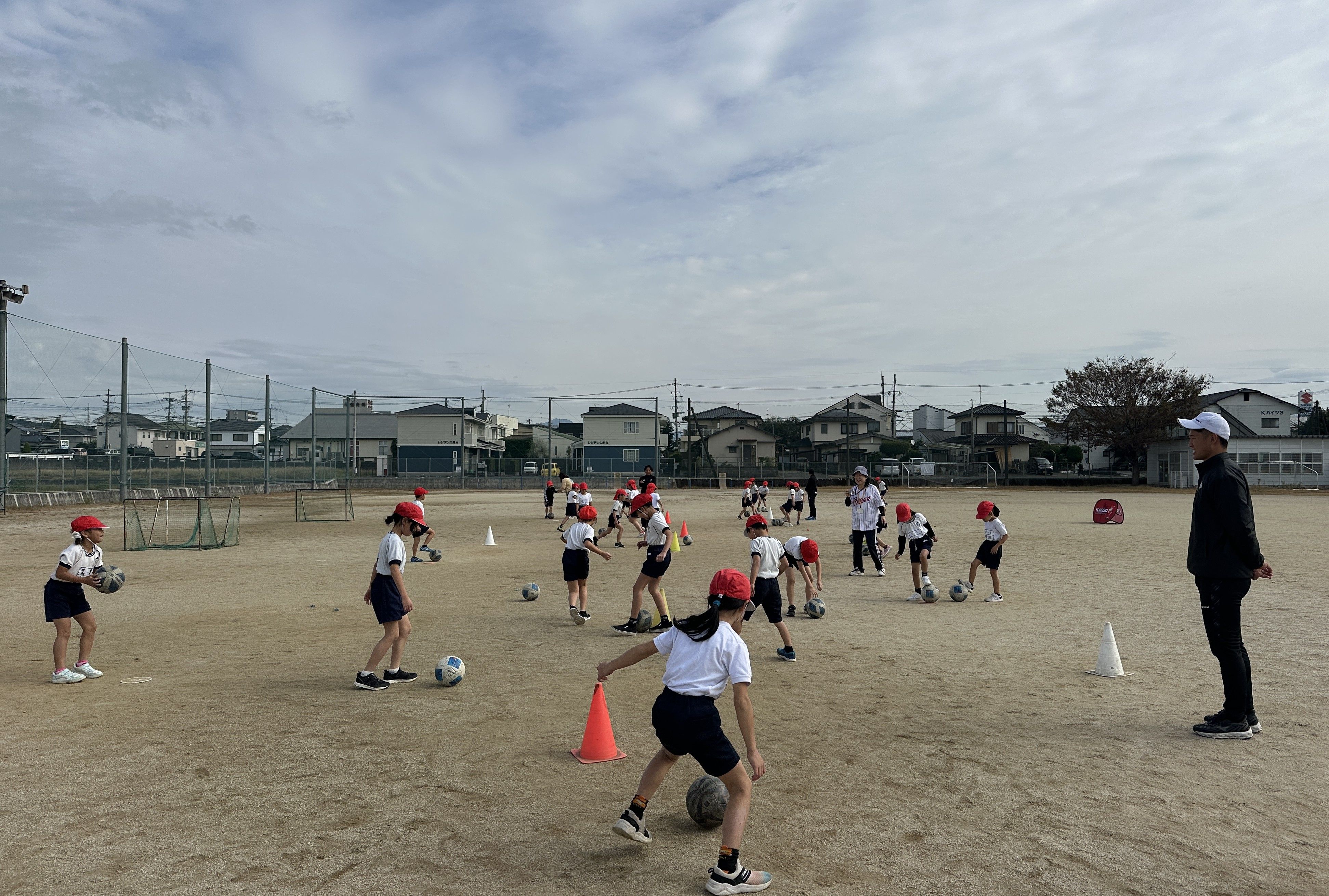 続いて、ドリブルやシュートの練習に挑戦し、初めてサッカーボールに触れる児童も積極的に取り組む姿が見られました。