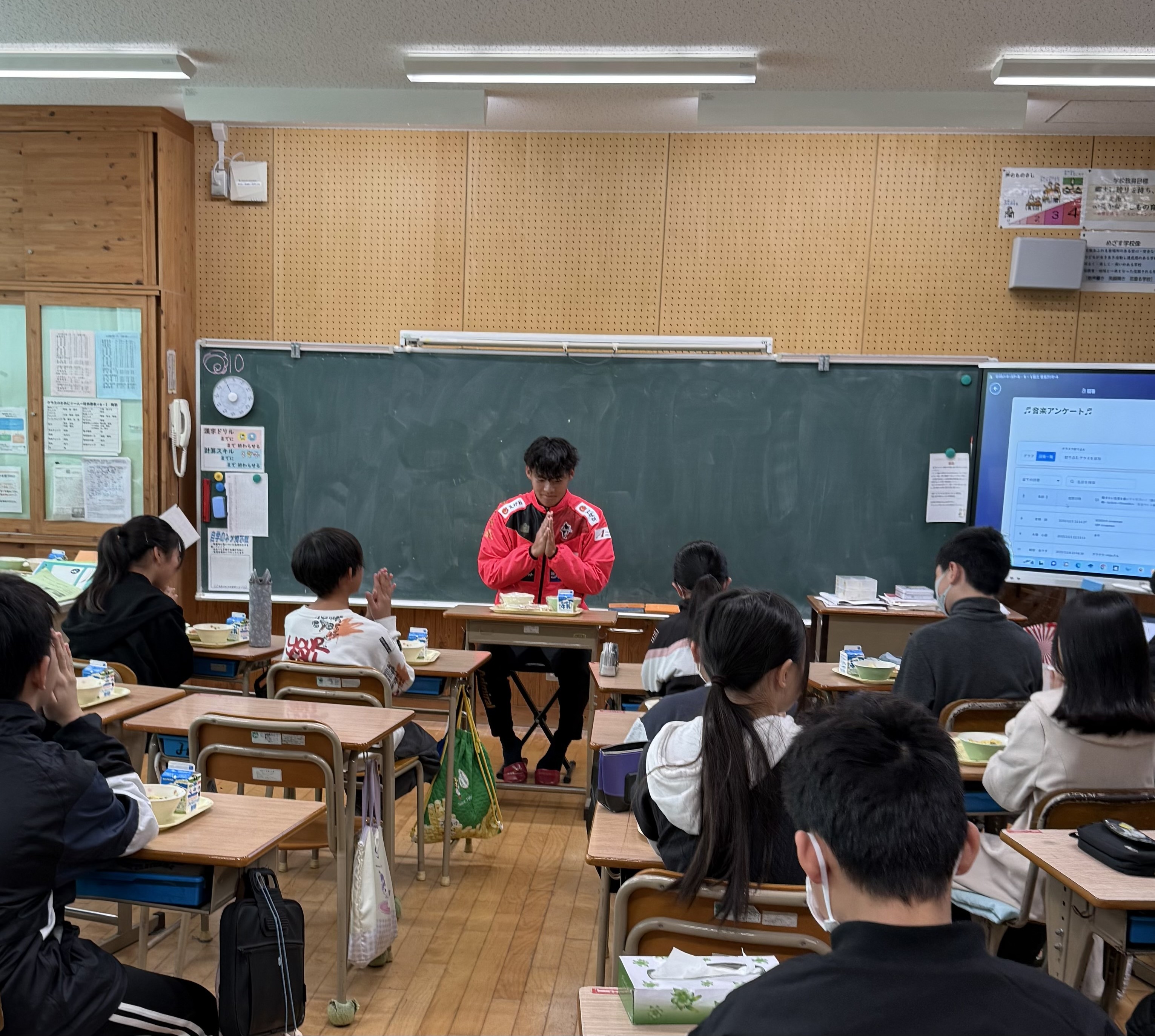 まずは選手がそれぞれクラスに分かれて、一緒に給食を食べながら、サッカーの話はもちろん、自分が小学生だった頃の話、好きな給食に嫌いな給食、また趣味のはなしなどをしながら、次第に打ち解けていき、楽しい給食の時間となりました。もちろん3選手とも給食は完食です。