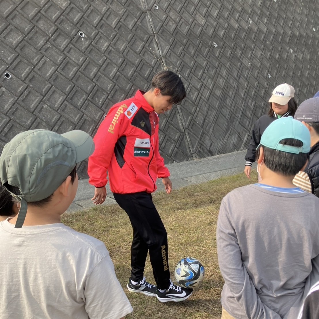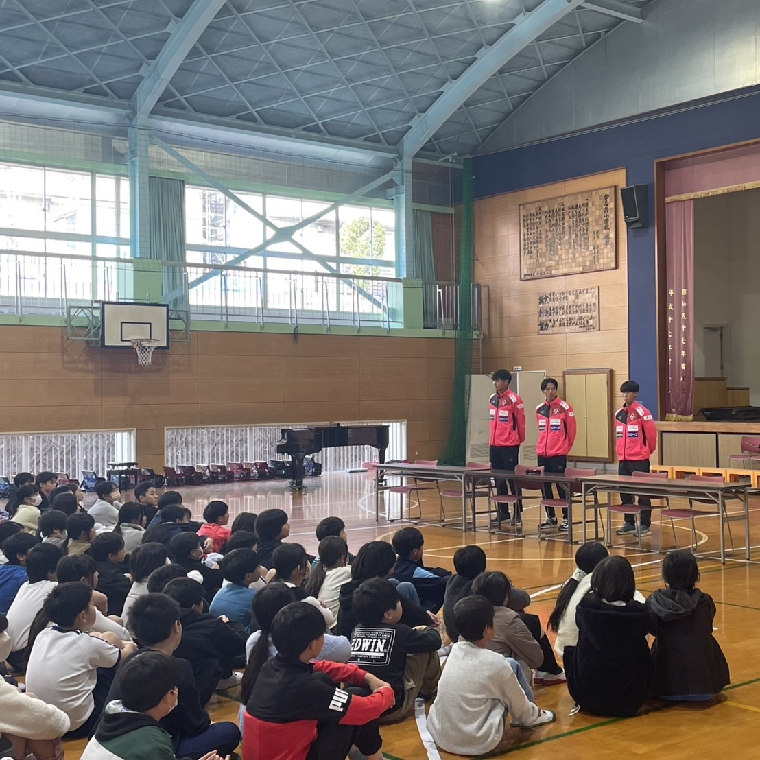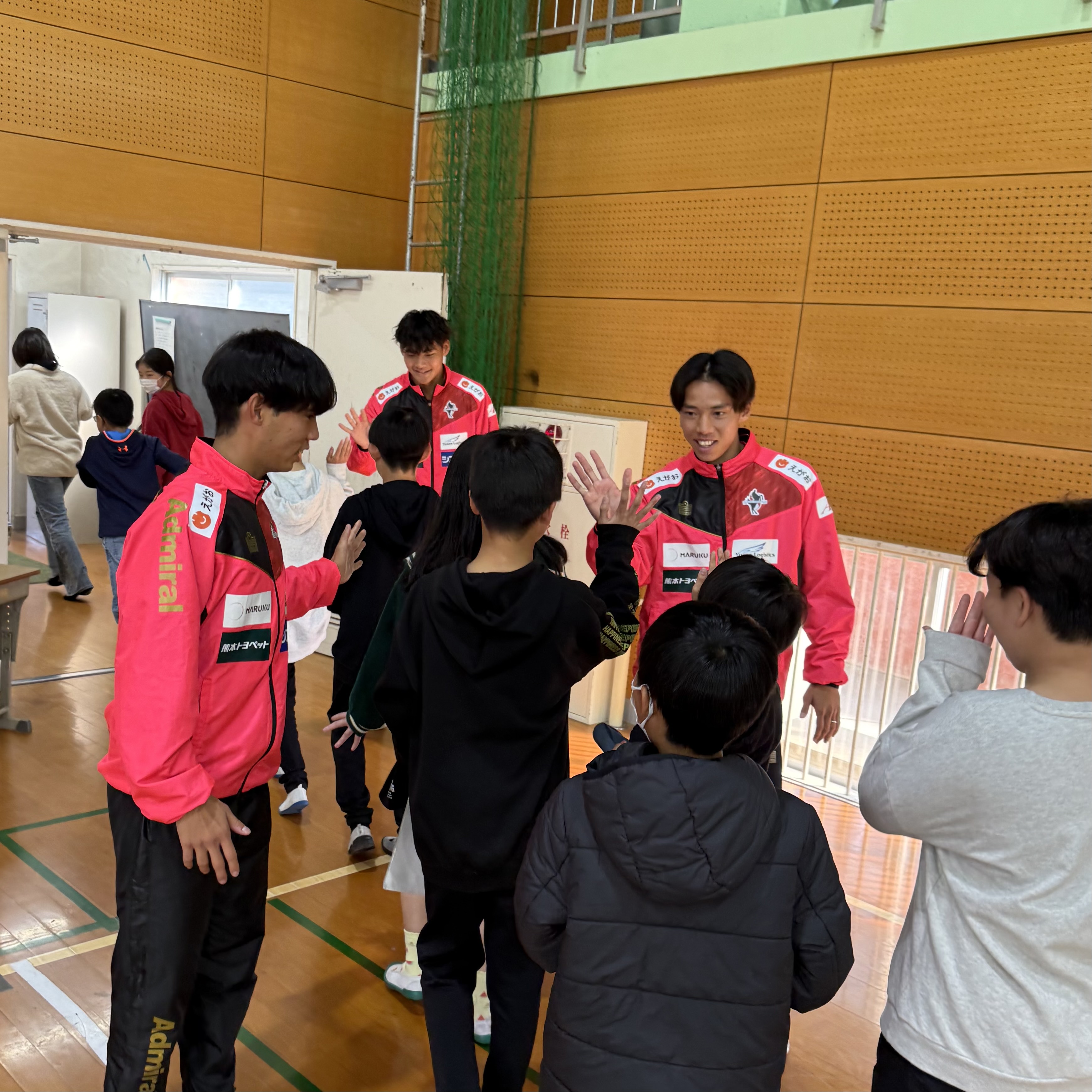 12月8日(月)、飯星明良選手、渡邉怜歩選手、長嶋志歩選手が合志市立合志南小学校を訪問し、児童のみなさんと交流を行いました。