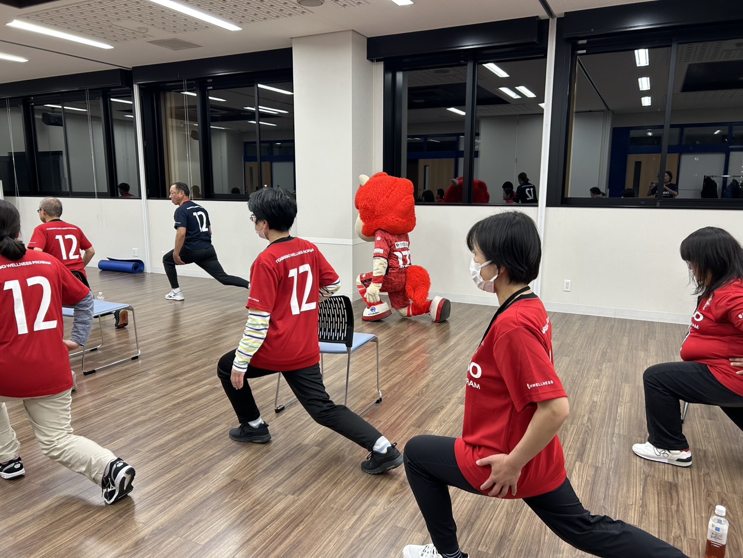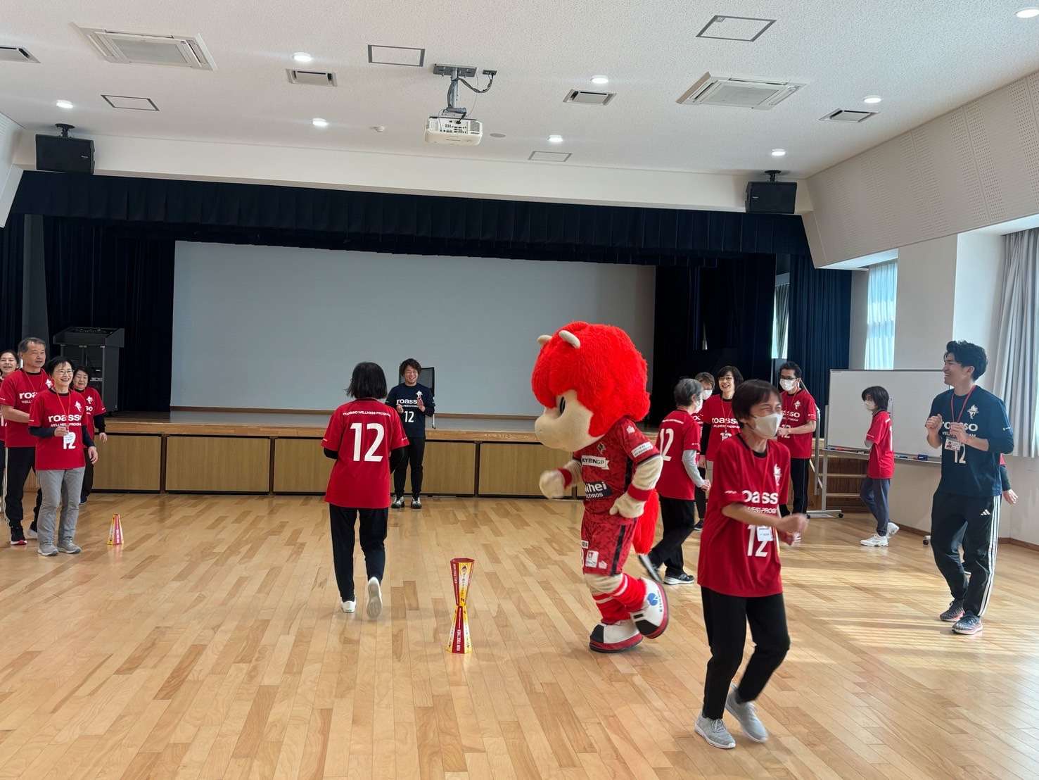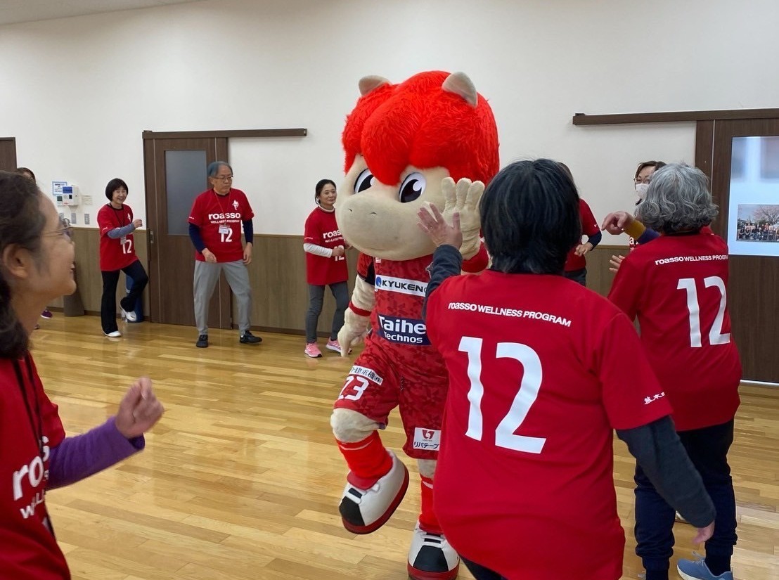 毎年、各会場での最終体力測定の前には、ロアッソくんが訪問し、一緒にプログラムに取り組み、参加者の方々との交流を行いながら、最後の体力測定へむけてモチベーションを高めていただくべく、応援を行います。今回もロアッソくんは、しっかりとプログラムをこなしながら、参加者の皆さんとハイタッチをするなど、一緒に楽しんでいいたようです。