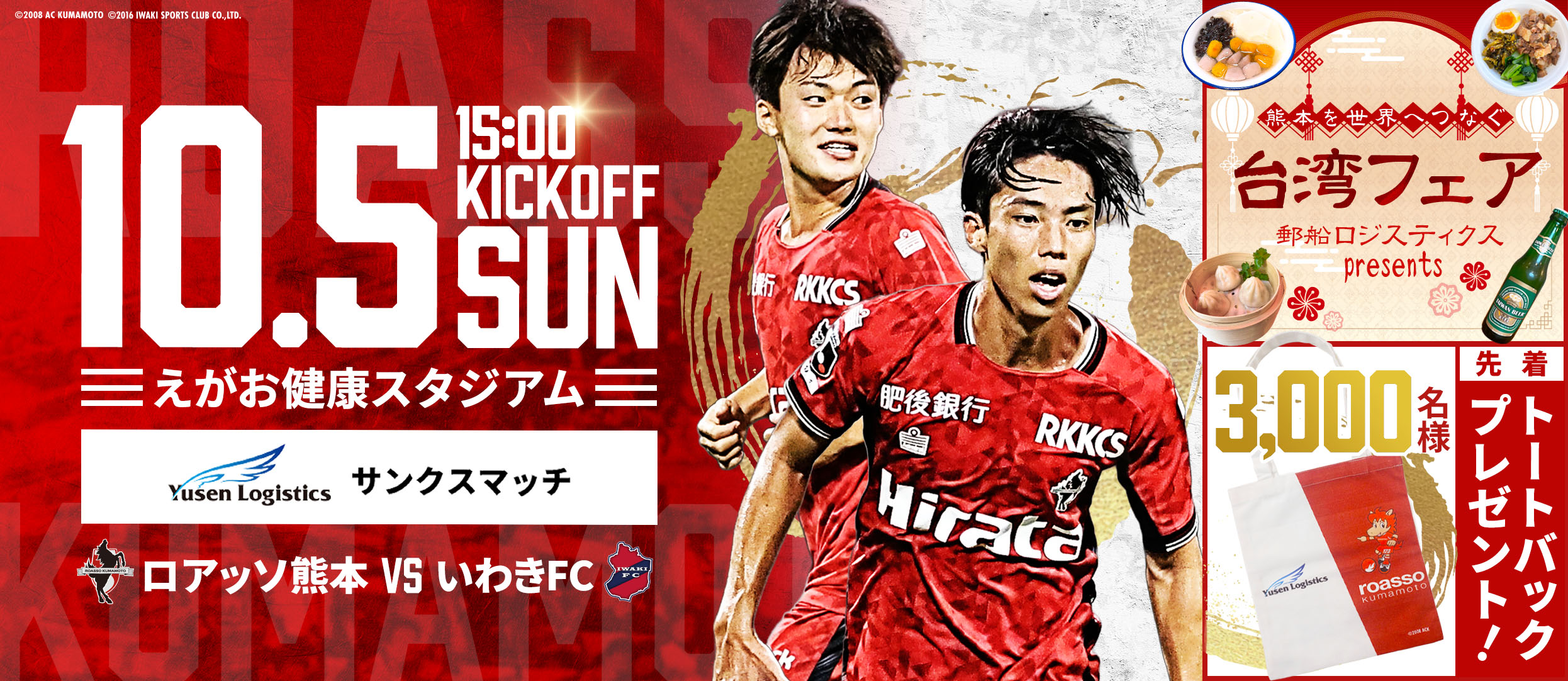 ご来場いただいた先着3,000名様に、郵船ロジスティクス様とロアッソ熊本がコラボしたサンクスマッチ限定デザインの「限定オリジナルトートバック」をプレゼント!多くの皆様のご来場をお待ちしております!