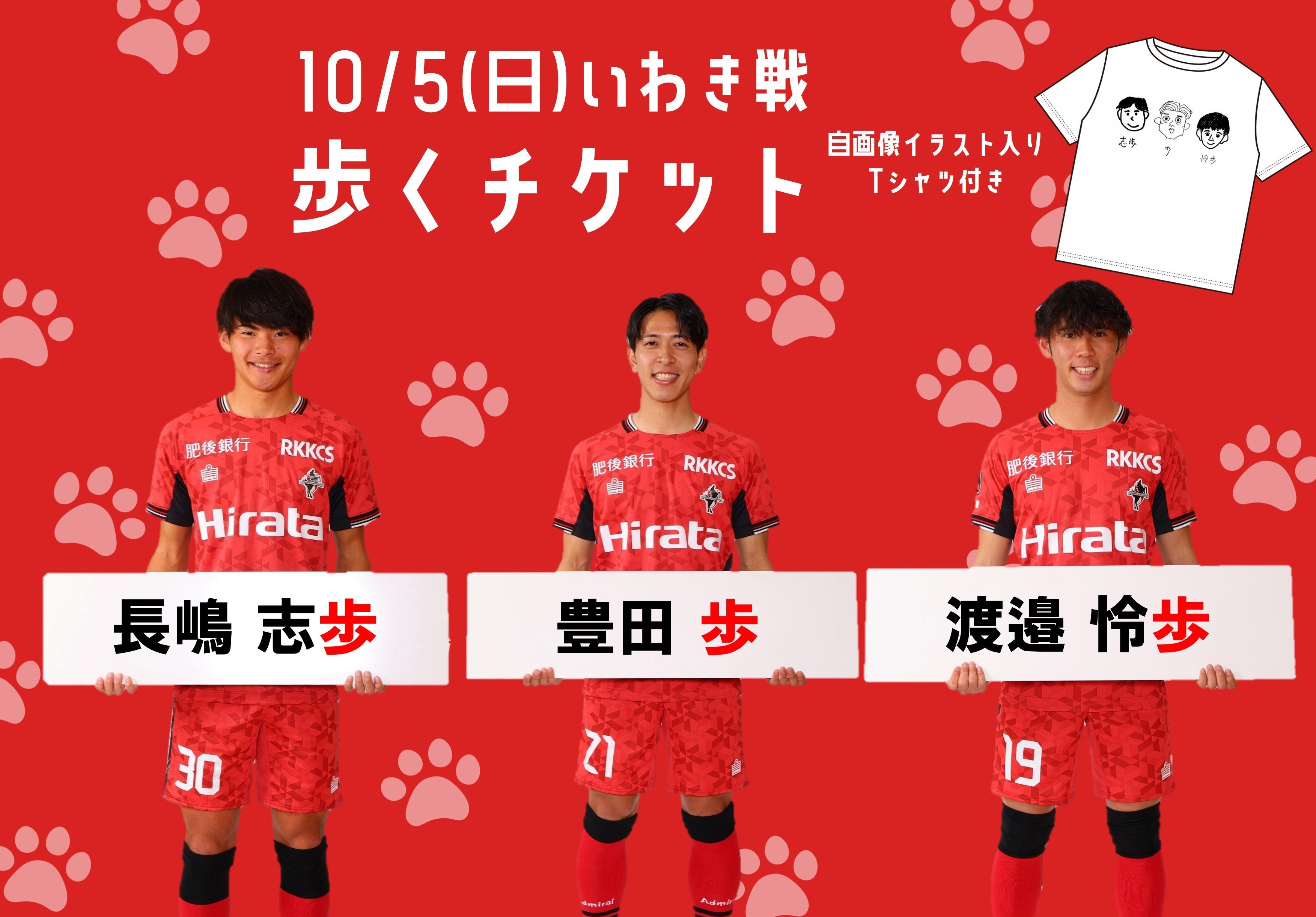 お申込みの方には、3選手が描いた自画像イラストが入った特別Tシャツのプレゼントと、試合後に3選手とハイタッチ&記念撮影ができる特典をご用意!