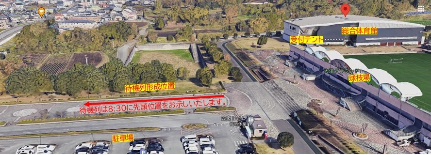 待機列先頭位置を当日8:30にお示しいたします。8:30より早く列を形成することをお控えください。開門時間近くになりましたら、スタッフが会場受付まで誘導させていただきます。