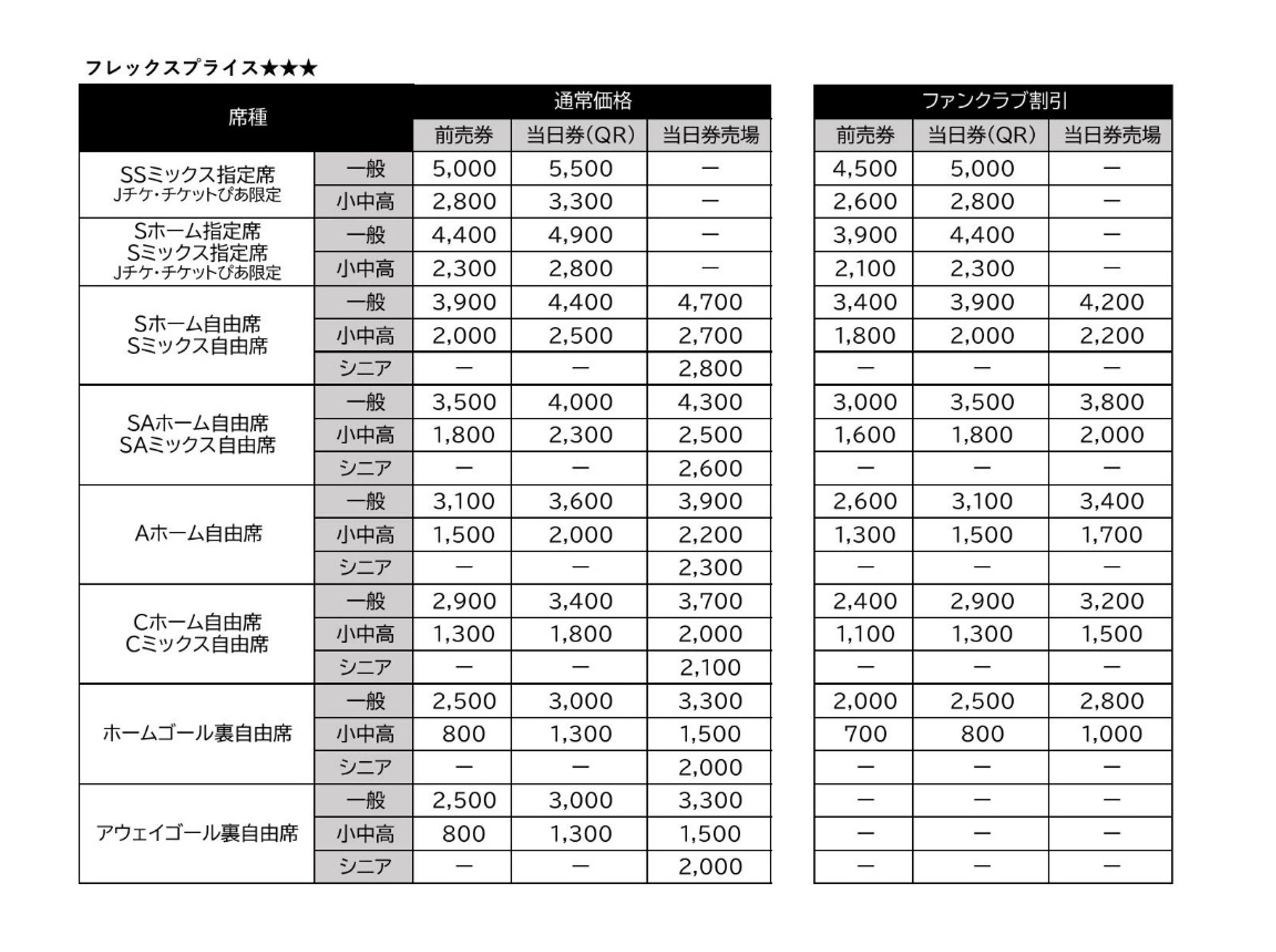 ※SSミックス指定席、Sホーム指定席、Sミックス指定席につきましては、Jリーグチケットもしくはチケットぴあ(セブン-イレブンマルチコピー機)限定販売となります。当日券売場では販売いたしませんので、予めご了承ください。
