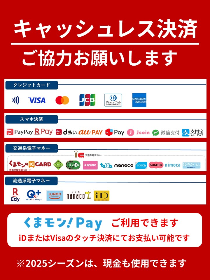 ※「くまモン!Pay」もご利用いただけます。iDまたはVisaのタッチ決済によりお支払いが可能です。