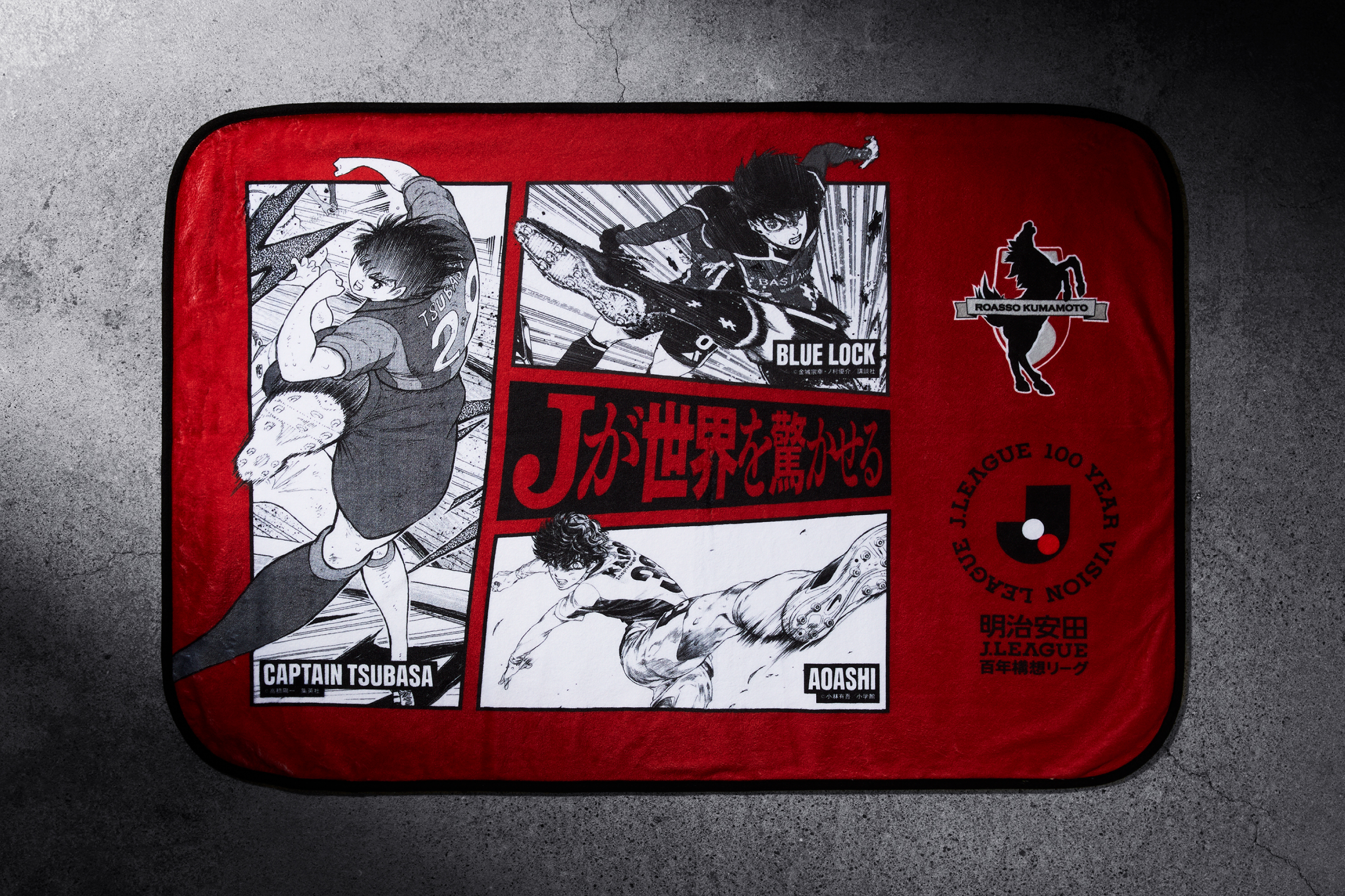 本企画は、シーズン移行に際して開催される特別な大会である「明治安田Jリーグ百年構想リーグ」を記念して実施されるものです。ブランケットのデザインには、日本が世界に誇るサッカー漫画「キャプテン翼」をはじめ、近年国内外で絶大な人気を誇る「ブルーロック」「アオアシ」の3つの作品との史上初のトリプルコラボレーションが実現しました。シーズン移行という大きな転換点を経て、Jリーグが今後さらに結果を出し、世界を驚かせるという意思を、3作品の主人公が放つ力強いシュートと重ね合わせ、メッセージとして発信していきます。