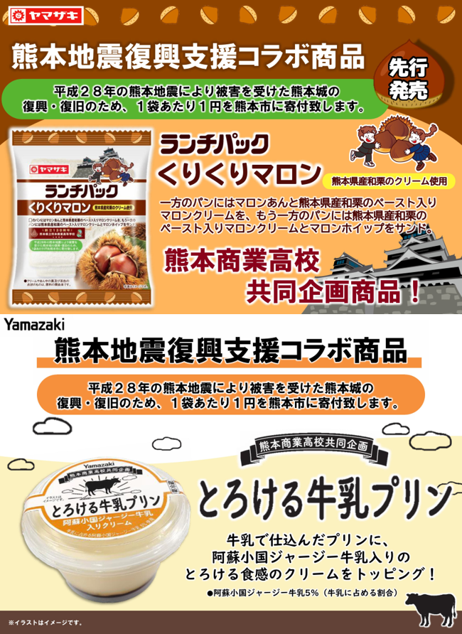 熊本県立熊本商業高校と山崎製パン様の共同企画による、熊本県産和栗を使ったランチパック「くりくりマロン」と、阿蘇小国ジャージー牛乳入りのクリームをトッピングした「とろける牛乳プリン」を販売します。